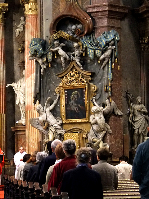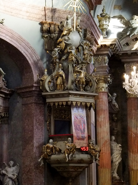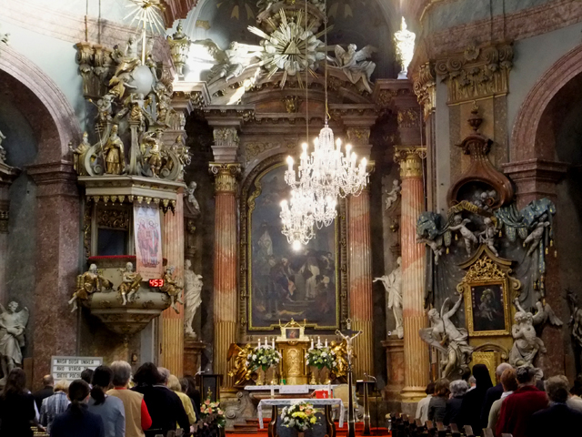 儘管外觀樸素,以雲紋大理石柱支撐起的大廳卻滿佈精心妝點。左方講道壇頂有各樣姿態人物攀繞球柱舞騰,右側聖母畫像上雕出由天使飛持、以假亂真的披掛布幡。而中央、在水晶吊燈後,主祭壇的全知之眼正映射著灼目耀芒,融化驅離人們心中的晦暗。