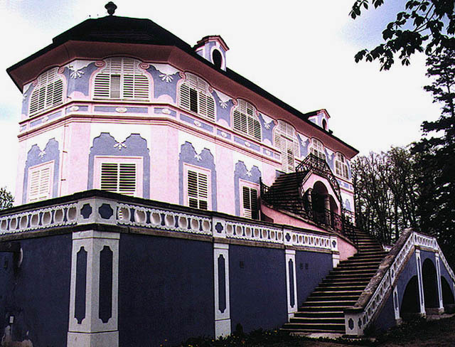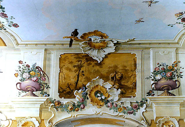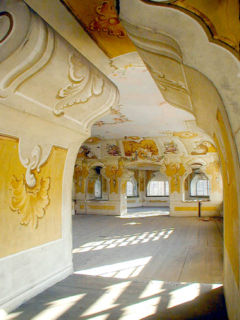 於劇院外望台眺看城鎮須臾,我們便循步道盤繞而下。不過其實若再往支路去,還有大片城堡花園。被切劃成不規則多邊形的草皮中,花叢排組成幾何圖樣,雕像點綴著疊層飛降水泉。再往內,是避暑別館,彎拱成懷抱形狀的階梯通向黃白捲勾的廳間。圖片裡,褪色壁面有著斑污,但依舊可見纖細筆觸在牆上點繪出艷麗瓶花,蝶鳥紛飛於串繞瓣葉。