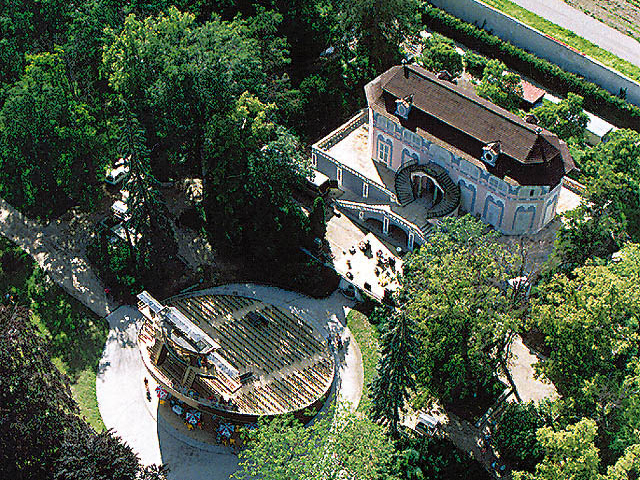 轉到坡底,頭頂是架高廊橋,以連拱交疊,支撐從城堡行出的雕像敞廊。從這角度望去,敞廊之上其實還有多層通道,分別直抵劇院包廂及花園。當時於敞廊行走,只專心遠望,沒察覺地勢,現於橋墩仰望才知其高聳,像個危崖薄壁,被風鏤穿出坑洞,顫巍巍立著。