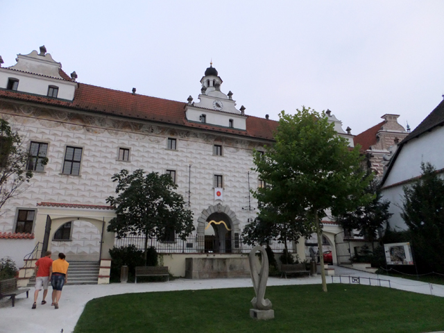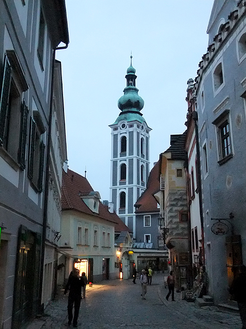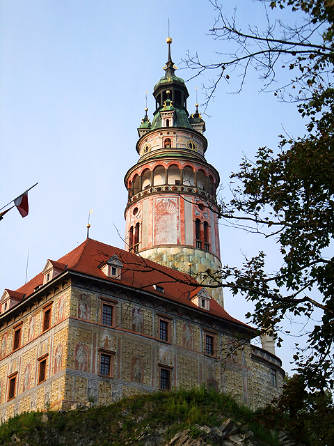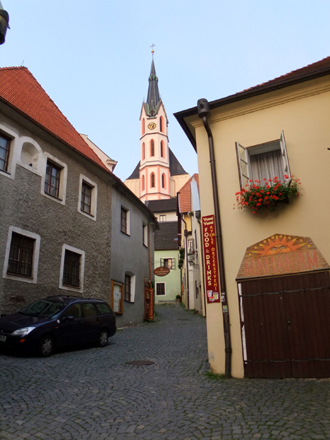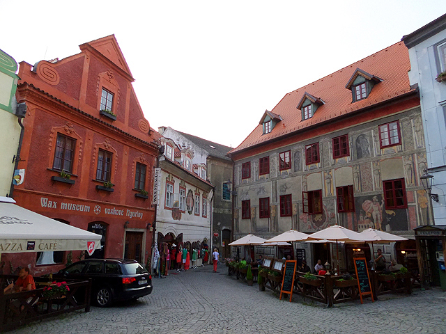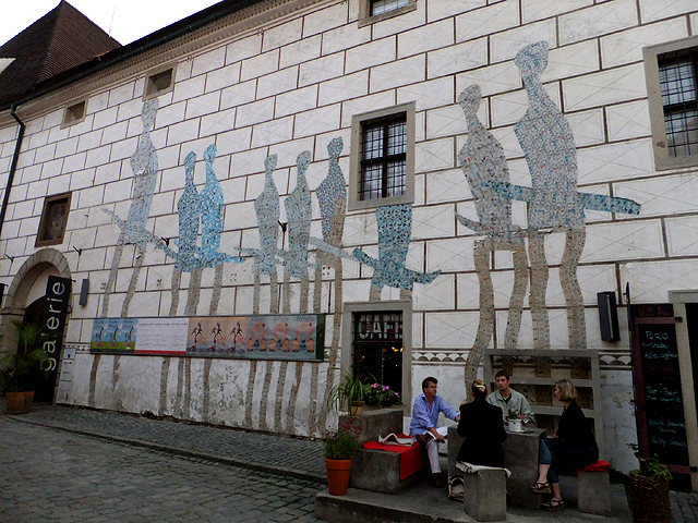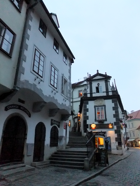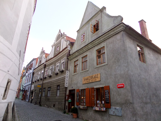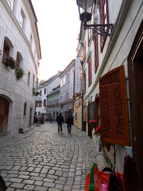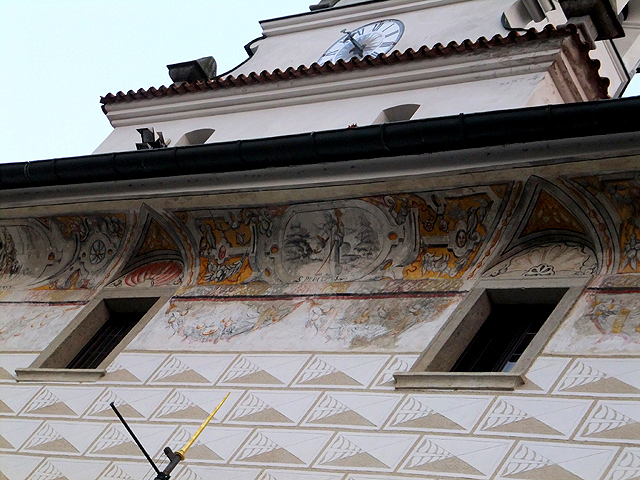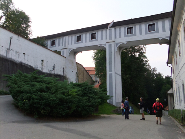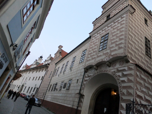 再次將旅程接回未行完之環道,漸漸地,地勢拔高,建築樣式似乎也隨之改變,像踏入貴族界域,格局嚴整了點,裝飾也華美些,可以看到勾繪假磚堆疊,偽拱串聯藤花於簷下。這兒有棟標上五瓣花徽記的薔薇旅館(Hotel Ruze),據說旅行社很愛進住這家由修道院改建的百年老店,順道搭配中世紀變裝晚宴,不過瀏覽網路照片,不合身剪裁加怪異搭配,我倒慶幸自己逃過一劫。