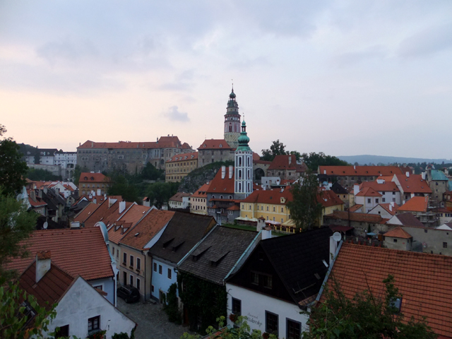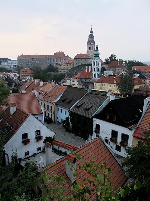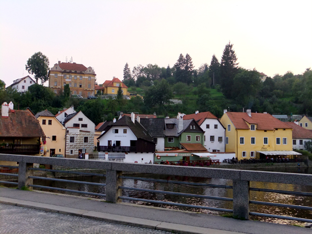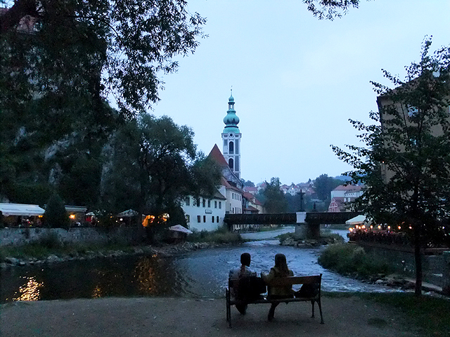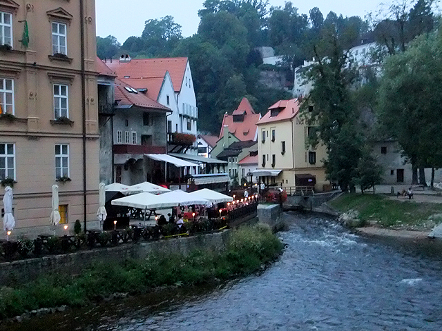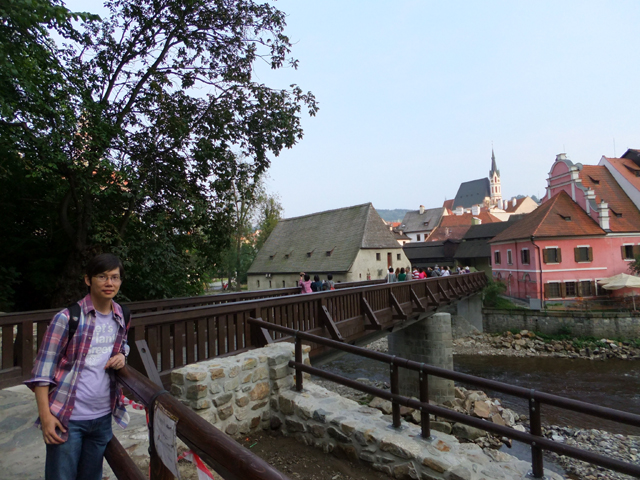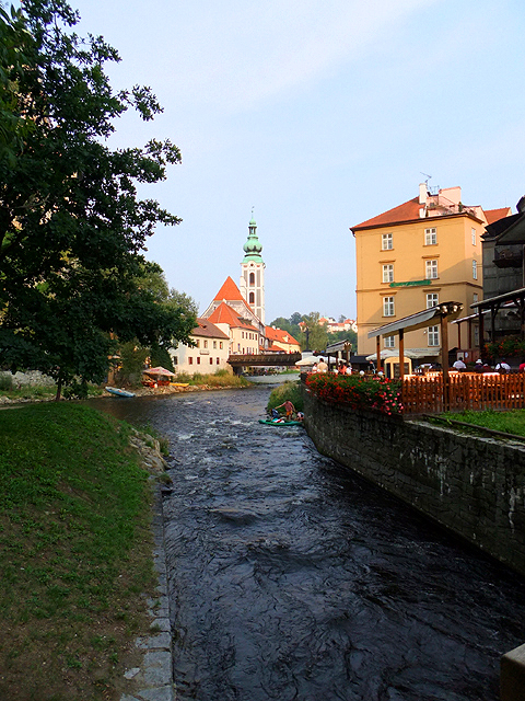 過了廊橋,便可見伏爾塔瓦河於腳邊湍流而過,相較於布拉格所見之寬廣,這兒的它倒似條小溪,歡快地唱著童歌、激踏水花。據說此地也有輕量級泛舟活動,但或許時近傍晚,沒見人如此轉繞於城鎮。不過少了嘻鬧人聲也好,能靜看紅簷於岸邊切畫堆疊出的線條,一個尖勾,一筆長捺,都是韻味。