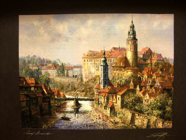 行沒多久,便遇上一家小店,門口掛上許多手工彩畫,還有幾個學生模樣年輕人,比手畫腳興奮相互討論。瞥了一眼,我也被迅速吸引,那畫作裡的庫倫洛夫比實際又多了些幻彩,以不同角度面向,隨季節更替在我眼前變換。有的遠遠勾出水藍河彎裡的幽靜小鎮,有的專注於彩繪塔的艷麗,鉅細靡遺點描它的紋飾。
