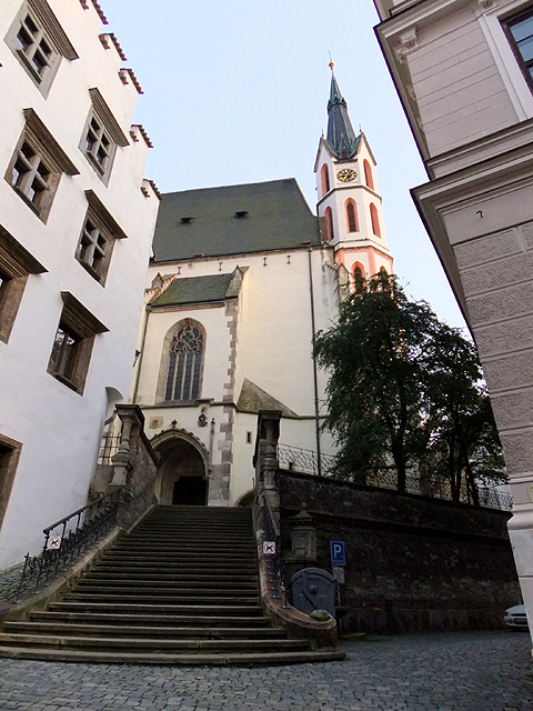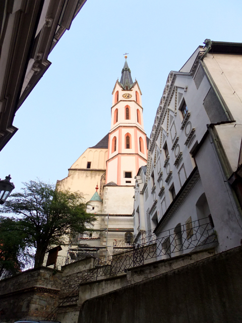 幾番鑽拐,我來到了聖維特教堂,它自然不似布拉格那座的氣勢偉峻,只是個簡單高簷建築,帶著鑲上淡紅窗框的鐘塔。不過彎弧步階、幾株襯映綠樹,立於矮坡的它卻有股屬於隱匿巷弄的遺世寂靜。似乎當鐘聲響起,雖僅這麼望著,內心也隨之澄淨。