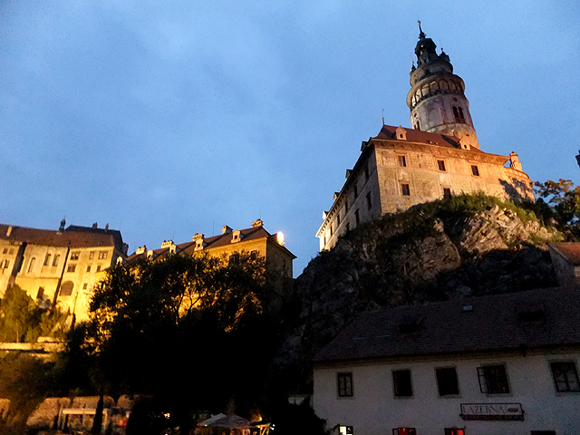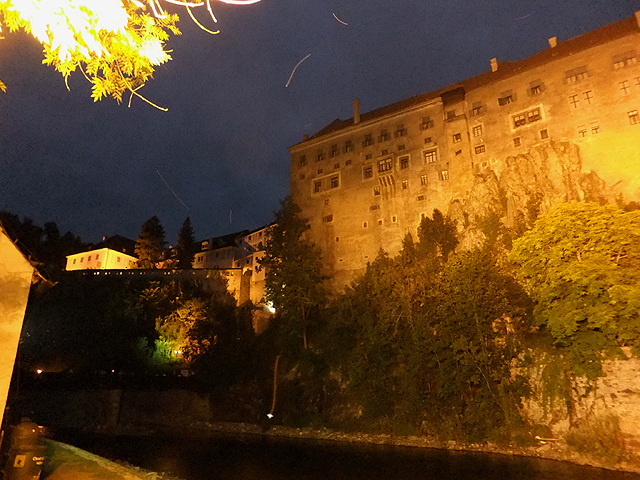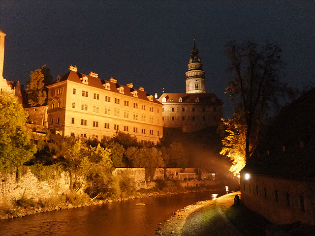 逛一圈出來,夜色已深沉,同樣的水岸,同樣的城堡與彩繪塔,此時因著投射光影,在墨藍天際下,暈染成金黃。而溪水的奔流似乎也緩慢了些,僅偶爾閃眨著。若在舊時,會否便是連綿的火炬,照耀搭載貴客的華麗馬車,一路通向岩上城廳?不過,現今望著,似乎一切都靜寂了,斑斕的彩繪塔只是個身影,站在山頭,追念、遙想。