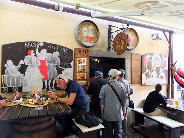 無暇一一研究端看,大夥像被放牧的牛羊,分心於身旁豐美草葉,卻被急欲在日落前抵達餐廳的領隊整路趨趕。才走出小巷,望見方正的鎮心廣場,我們又一個轉彎,鑽進隱密窄弄。據說路邊此店以豬腳料理聞名,若無提早預約,恐怕得排隊至夜深。