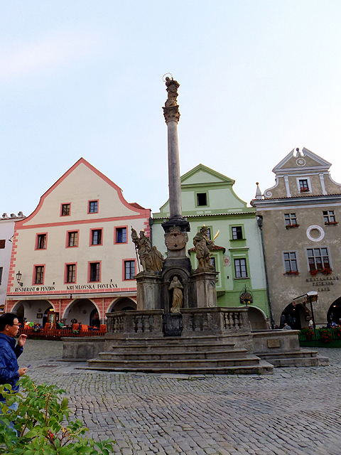 走至鎮心廣場,周遭房舍素雅,僅有些帶著鮮豔勾邊。不免俗地,中央也有根黑死病紀念柱,以與小鎮相符的質樸風格,簡單於台座柱頂立上人像。稍微複習一下腦中地圖後,我飛快踏入鎮內主要環道。