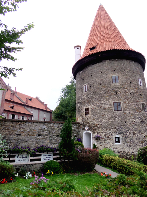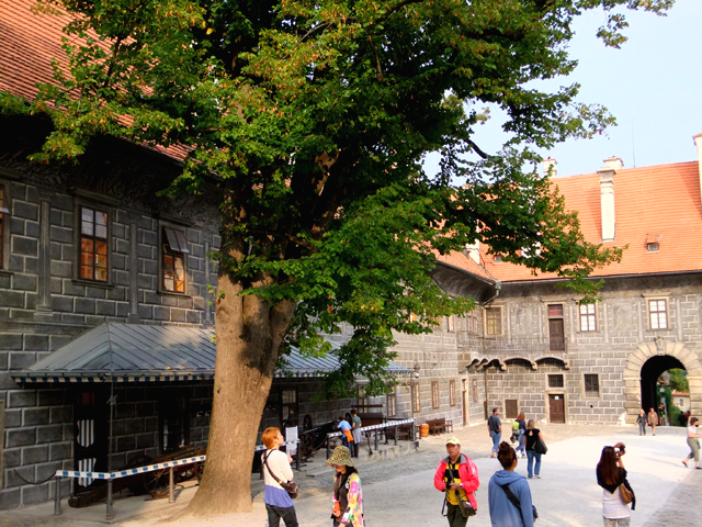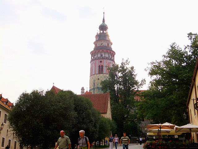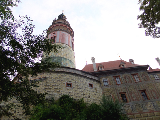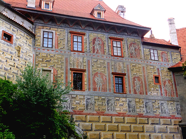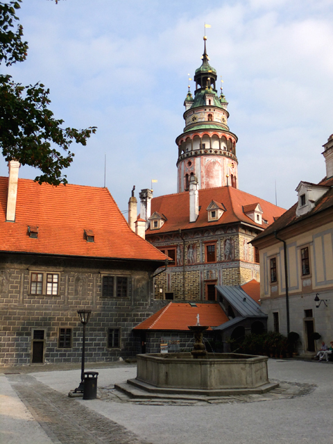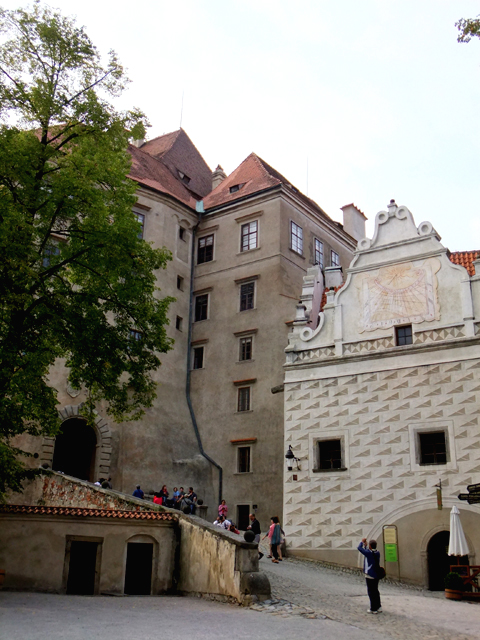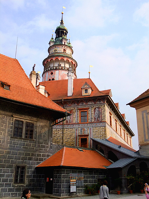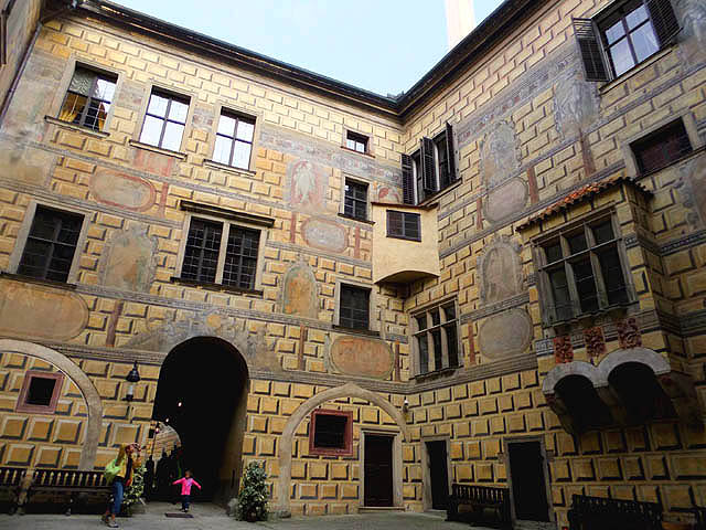 原來我們已到了城堡第一中庭,而那是此鎮地標彩繪塔。它的歷史可追溯至文藝復興時代,儘管無法像義大利那般取得各樣石料,卻發揮創意,以色彩襯出立體明暗。雖曾被歲月刻蝕得斑駁陰晦,但經按圖修復,它又再度披上華裝,明豔照人。