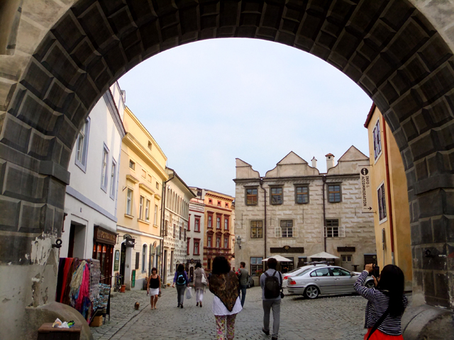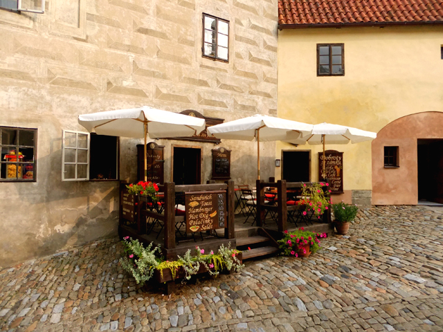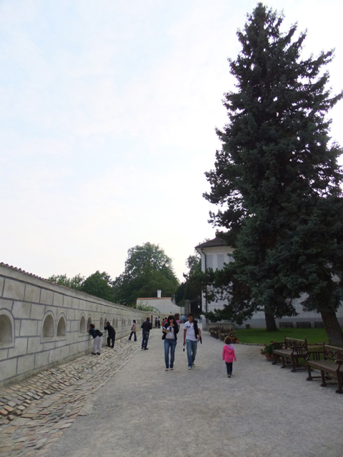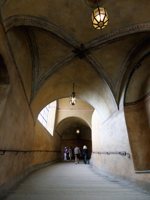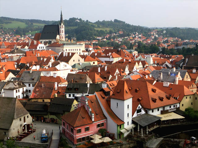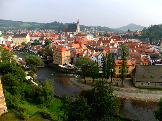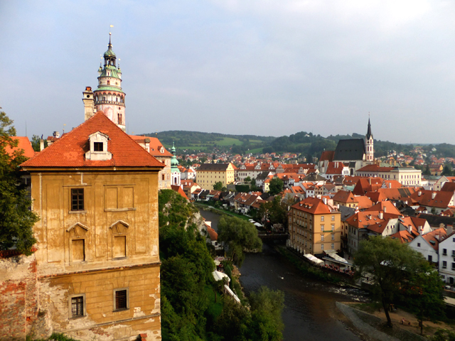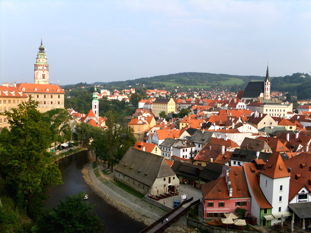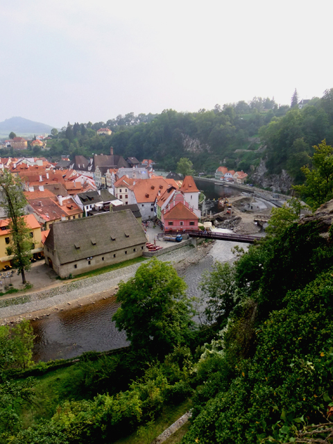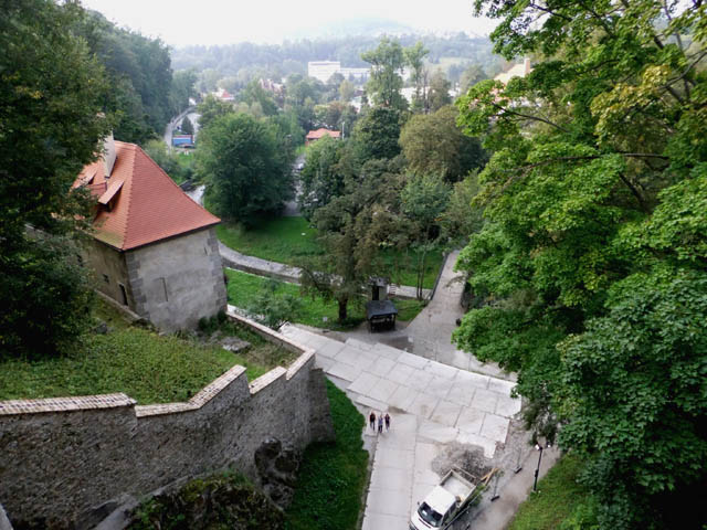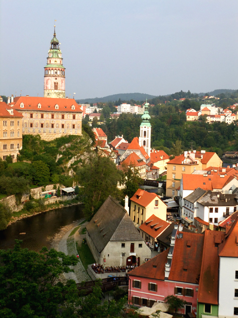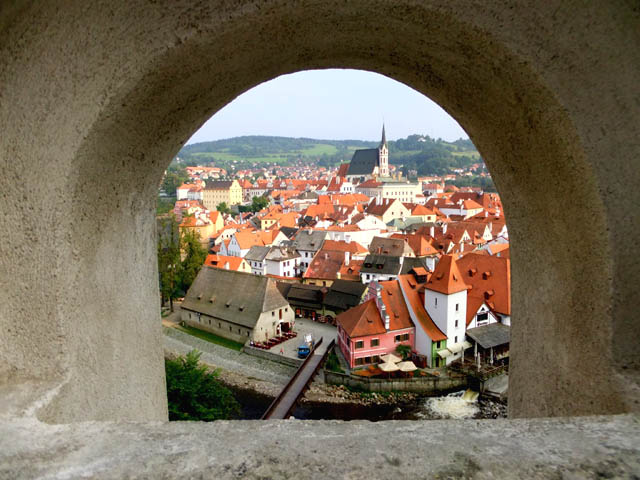 廣場的另端,一條坡道通往「上城堡」,外壁灰灰褐褐平凡無奇,寬大門廊內也僅見簡單肋拱,不過循著這可供馬踏入的「騎士坡道」,旁側便有窗口讓人興奮遠眺。城下,有與布拉格相似的叢聚紅瓦,但並非無邊無際漫展,而是精精巧巧被圍攏在山巒間,一道河彎悠然劃過,將其輕輕環抱。像張塗抹上黛青淺碧的畫布,於中碎點出亮橙斑褐,然後大筆一揮勾出水藍長帶。