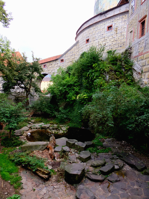 橋下應為以前的護城壕溝,不過現今樹叢亂石圍著小水灘,看似棄置,卻其實成了熊的居住地。據說早年領主與義大利的歐西妮家族(Orsini)有親戚關係,而捷克語的Orsa又為母熊之意,就因這牽強關係,此城多了守護聖獸。然也不知今日發生何事,大夥左瞧右看卻不見一點毛茸茸身影,難道牠們也有週休二日?