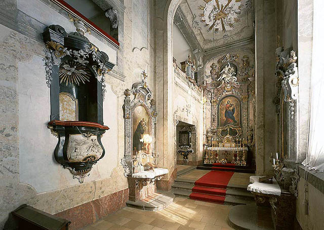 唉,若我真有這本領,也不必整路悲嘆了。好在此處官網有著詳盡介紹,上面標示若選擇大眾化的第一路線,城堡靠崖這側有聖喬治禮拜堂(Chapel of St. George),它不大的空間內依舊擺設精緻巴洛克祭壇,以飛曲勾邊框飾聖母子圖像,而於天頂,蓬雲金芒間浮透代表三位一體的三角尖錐與全知之眼。