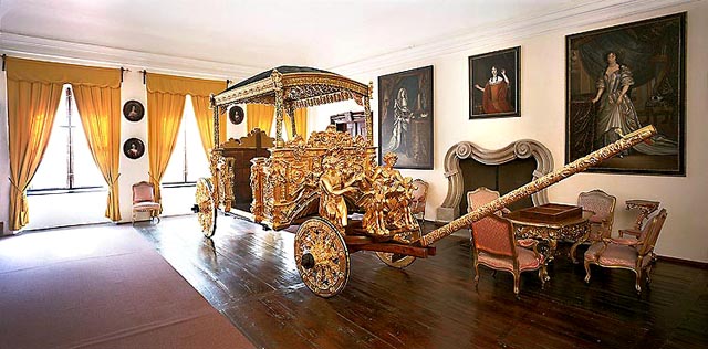 轉個彎,來到後續的艾根堡(Eggenberg)家族年代,這兒有金馬車展示間。車體從頂帳綴邊、護欄人形支柱、至裸身馬夫,皆勾繞得細緻璨亮、泛著流光。堡主當年駕此車代表皇帝與教宗會面,不知有否想過會張揚招忌?