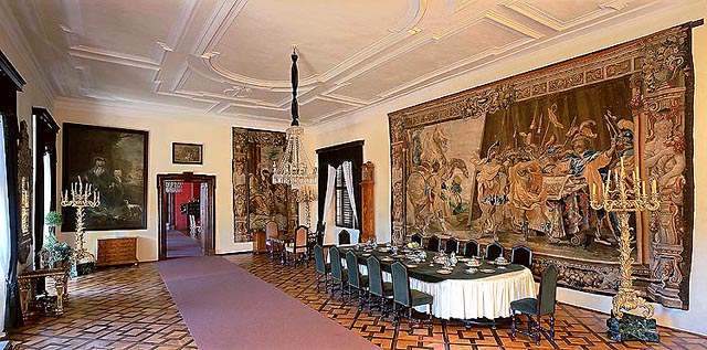 時年推移,接著掌權的史瓦森堡(Schwarzenberg)家族將城內帶向巴洛克風。當走入附有長桌與大型壁毯的餐廳,可看到精緻水晶吊燈與纏藤翻葉燭台。而隔鄰臥室色彩轉為鮮紅,壁面隱透紋飾,梳妝台與桌椅的勾邊化作洛可可複雜捲焰。