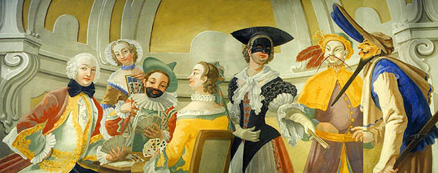 最特別的是後段鏡廳與面具舞會廳,前者發揮此地最擅長的詐術,在淺碧鑲鏡房內描繪龕室,擺入永不凋謝的瓶花,然後於拱框交會處添上曲譜與琴鼓。後者壁面畫出包廂、護欄與拱廊,穿戴華裳面具的貴族們或坐或站,有些交頭碎語、表情帶著戲謔,有些則彷彿酒酣耳熱,接續便要放浪形骸。可以想像當夜黑燈明,舞於廳間,就像真身處華宮歡宴,賓客如潮,然後便有詭譎勾心鬥角於暗處發酵。