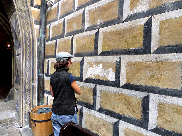 領隊說這是種稱為刮畫的技巧,先上好層層顏色,然後再依圖樣刮去不要部份。現場剛好有個學生模樣少女,專心對剝落牆面作修補,而她附近的一道小門,便是通往城堡導覽之路。然我們只是個省錢趕路團,又怎能奢望。於是我輕觸壁石,與沈寂其內百年的精靈互語,拜託它替作我的眼,引領穿越各扇廳門。