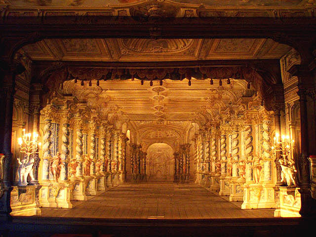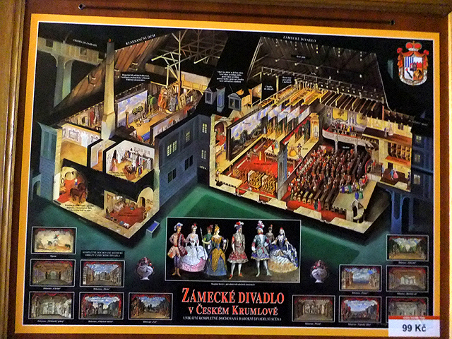 拱廊通往另端的第五中庭,旁邊看似平凡的建築其實是城堡劇院。為保護古物,現已不對外開放了,僅偶爾於節日舉行公演。它內廳以鵝黃淡藍相互幫襯的色調,在天頂聚攏成雲煙中的騰舞天使。雖經歷後期衰頹,仍幸運保留細緻簾幕,並修復了大量舞台景片。這些景片在深廣舞台上,多層次地從兩側疊至最裡背板,營造立體效果。同時透過滑輪拉繩組成的機關,快速切換主題。