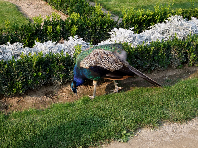或許時節關係,未見繁花各色爭豔,僅有幾叢深紫在碧野裡點綴。我行於當中立有成列雕像的小徑,竟發現有隻孔雀在路邊啄食,似乎失了斑斕尾翼的牠也不怕人,自顧自在我身旁踱步。我望著周遭紅瓦屋舍,正前的殿閣開了三道巨大圓拱,是個挑高涼廊。