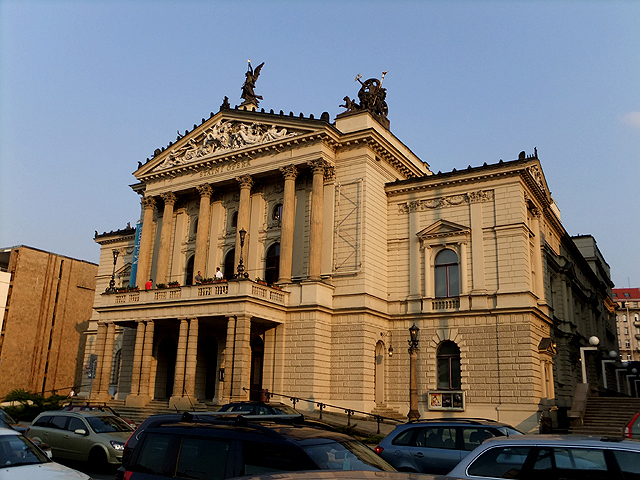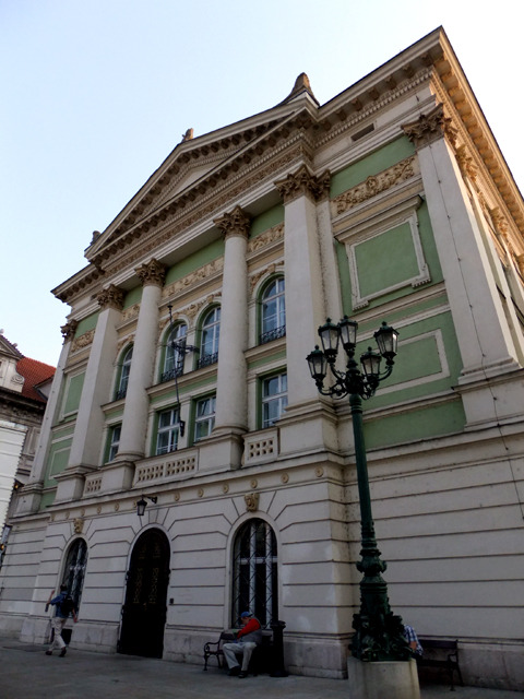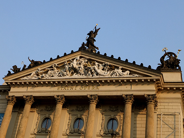 往捷運入口行回,途中瞥見馬路對側的國立歌劇院(The State Opera),外表是很典型的希臘神廟式門楣加雙層柱廊,花藤帶飾圈繞牆上圓窗,最頂有天使倚坐戰車,吹響燦金號角。門楣上的刻繪倒雕鑿得很深,駿馬飛馳,人物拉伸臂軀、裸身相互扭纏,彷彿正上演一齣令人血脈賁張的爭鬥。