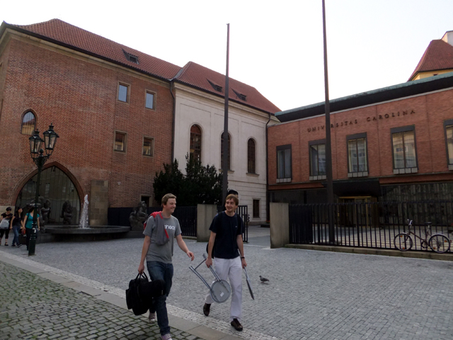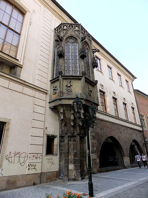 劇院隔鄰是查理大學(Charles University),也有人依拉丁語翻作卡洛琳南,想當然這座中歐最古老大學又是由知名的查理四世創立。建築隨歲月歷經多次改建,現已偏向現代簡潔風。早期的哥德裝飾,除了一些迴廊裡的肋拱,能讓人駐足端賞追溯的也只有外牆一處凸出窗臺。它底部的多角柱呈凹弧向上發散,至二樓轉以長玻璃花窗與細龕室交錯,加上石像鬼排水口與各樣妝點鏤雕,讓人不禁遙想最早整個完整殿堂會是什麼模樣。