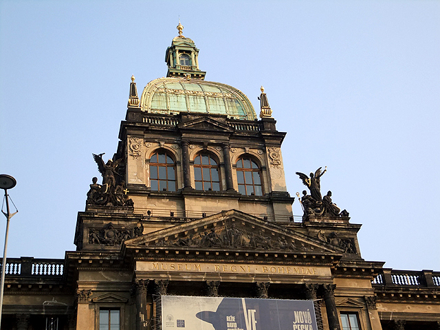 走出地面,就可以看到國家博物館(The National Museum)在不遠處。它的結構體是粗糙棕黃岩塊,不少處還沈積著墨黑污跡,但卻像個歷經多年戰事的老將,自有其淵渟嶽峙的霸氣。抬頭望,拱窗、方窗於橫展立面整齊排列,走新古典風格的它自然有希臘神殿式的三角門楣,兩側加添展翼天使群像。再往上,中央及兩端都有銅綠拱頂,鑲著金邊閃耀輝光。