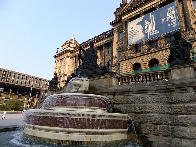 無奈地從階梯下至外部底層,這兒有個水池,雕座上象徵河流的人像或坐或躺,細泉從獅口噴吐,一層層飛散如傘而落。在此處來回踱著胡亂拍照消磨時光,看前方瓦次拉夫廣場遊客如織,便又穿過馬路去那晃盪。