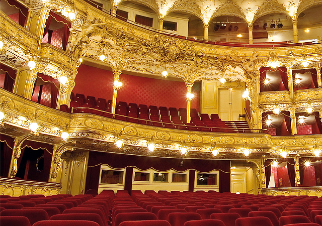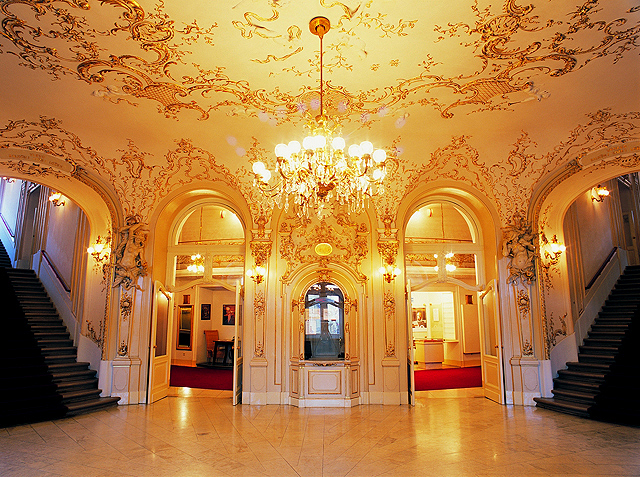 停駐端望幾眼,有股衝動想過去一探,畢竟圖片裡,隨處可見洛可可式的金色攀藤勾繞水晶燈照亮的廳堂,而在劇場裡,瓣葉更顯繁密,在深紅布幔座椅的對比下極為耀目,花海激出碎浪,從燈座、人像、襲湧至天頂壁畫。然根據經驗,若非有買票看劇,很少會開放遊人隨性進入亂逛的。況且就算提供付費導覽,我也沒多餘時間了。