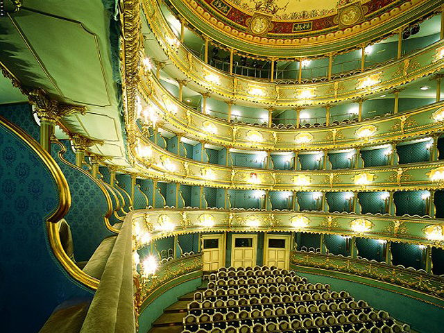 還好這回我的直覺準確,沒多久便發現它於不遠窄弄間。白底建築夾以淡綠牆面,這樣的色調在城區內顯得跳脫。我稍微繞至正面,它外觀中規中矩,山形牆與縱橫柱框,僅在柱頭與飾帶雕出些悲喜人面與花葉。倒是側方的露台墨欄,細緻點上金紋,增添了些許貴氣。不過大部份外在低調的劇院,內裡都有著華裝,此處也不例外,其主廳以靛藍為底,金色流紋編織,圓頂用斑彩於框邊細密勾花。然這份瑰麗景緻,我也只能用網路相片稍解進內一觀的渴望了。