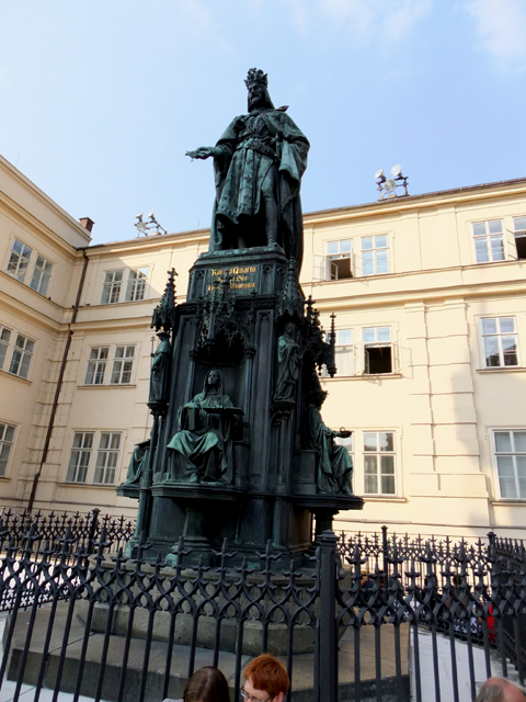 這兒有個紀念台座,斑斑駁駁的銅綠,便像承受了長年風霜。其四面鑲入哥德樣式壁龕,人像或坐或站、持著儀杖書本,不知是怎樣身份,不過最頂便為赫赫有名的查理四世,蓄鬍戴冠,威風凜凜。