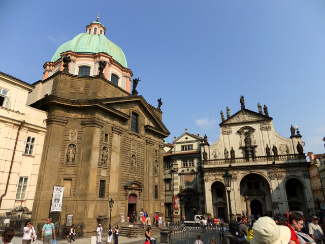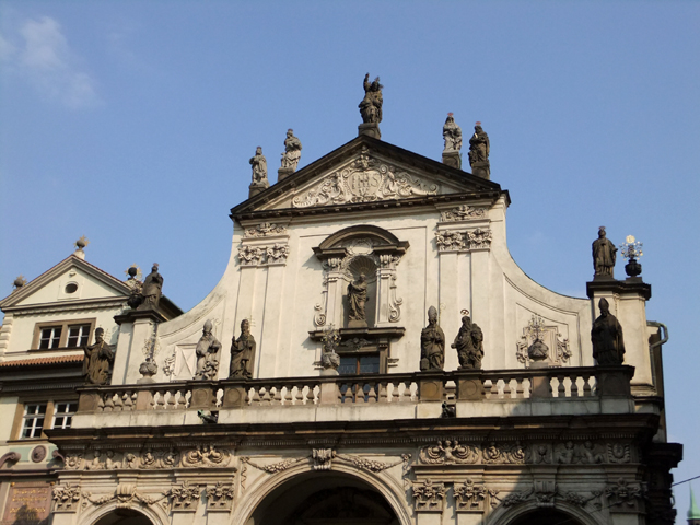 右側聖薩瓦特教堂(Church of St. Salvator)連結後方克萊門特學院(Klementinum),是布拉格第一座基督會教堂。它的立面以山形牆攜兩側凹弧連接下方三道拱門,並用細密綴飾的柱頭與橫帶妝點,建築上部的屋簷及露台更加添姿態各異的主教雕像。往旁巷望去,教堂邊側的樓閣以類似的山形頂簷重複綿延,也是種特出景緻。