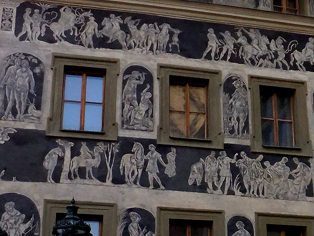 在這個方向,我注意到舊市政廳旁的一分鐘之屋(The House at the Minute),這奇特的名稱由來似已不可考,不過牆角有個伸爪白獅雕像,是當時白獅藥局的象徵,再後來便是卡夫卡一家搬遷進來。然對我而言,引人的反而為壁面的細緻刮畫,神話場景以簡單黑白雙色呈現,能見到男女閒適悠遊,也有兩軍殺伐對戰。
