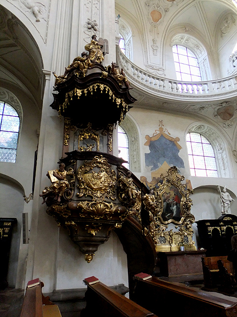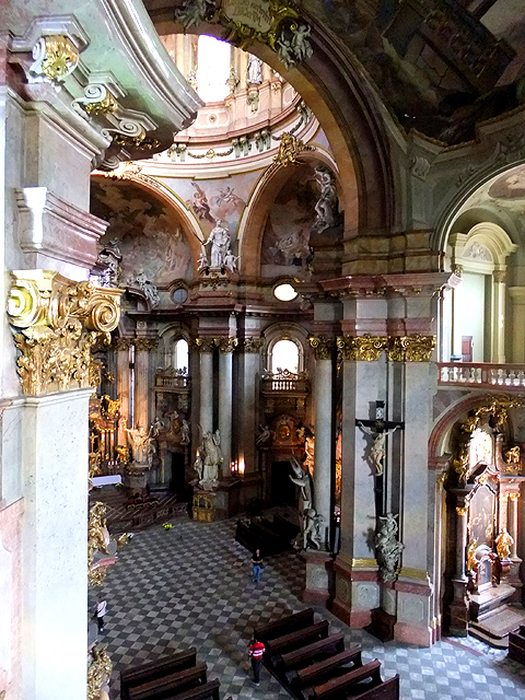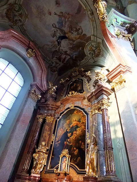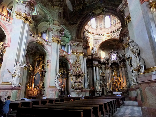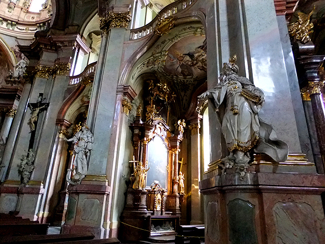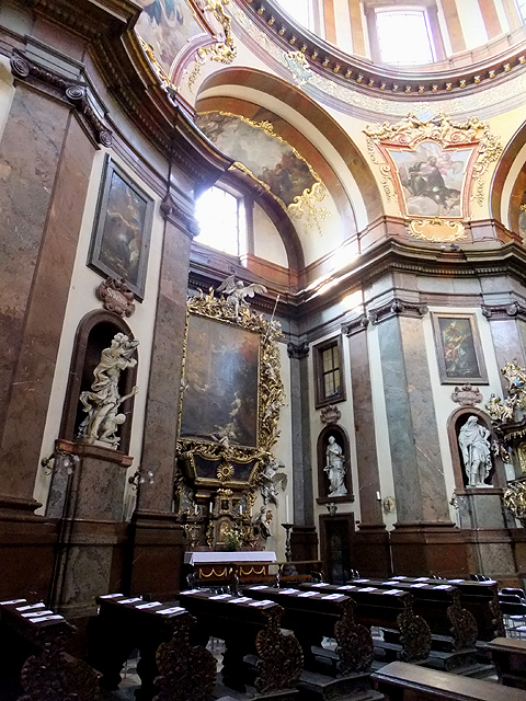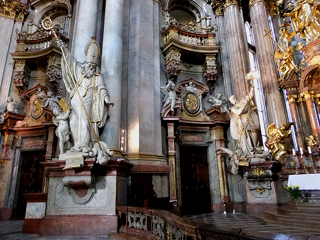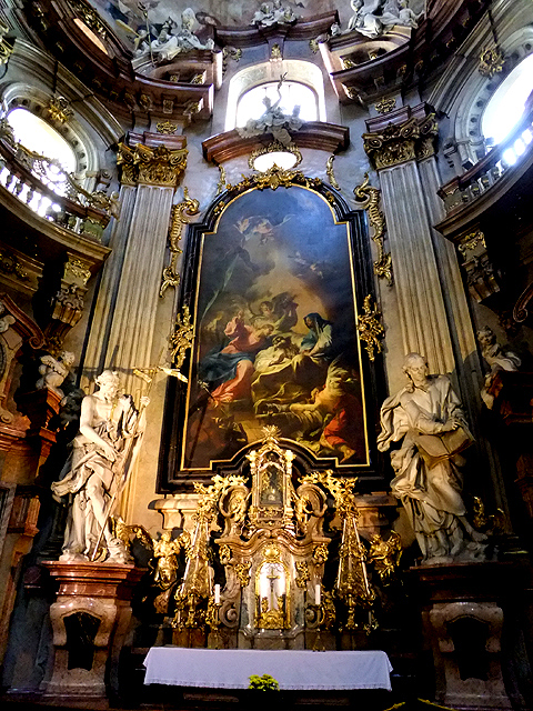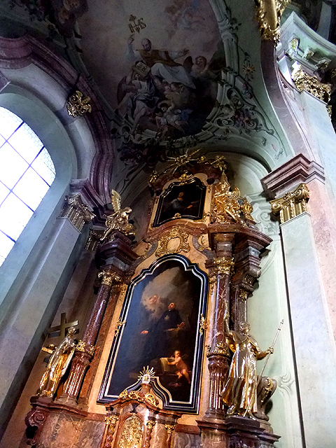 兩側耳堂以長幅彩繪為主,被人像護持的壇座自然有燦金竄流成藤葉耀芒。精緻的設計若擺在一般教堂都是主祭壇規模,如今卻只為這片連綿景緻的一隅。而四周高柱是巨樹,將景緻推往上,那兒有飛揚人物或聚或散,塗抹在雕像間的半拱,彩繪於天窗上的圓頂。