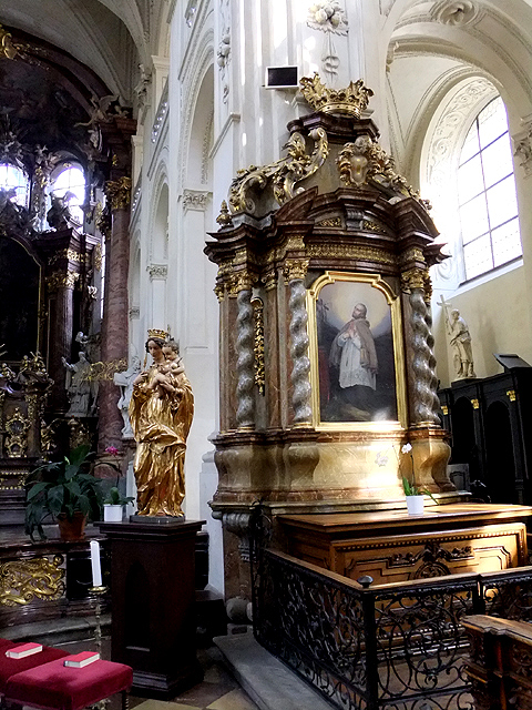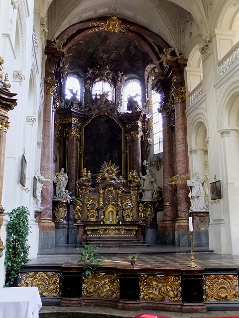 裏面空間皎潔明亮,白色壁面以拱線切割,飾上幾何形狀框格。走到建築十字交叉處,可看到華麗巴洛克風格呈現於講道壇跟祭廳。尤其是正中主祭壇,在這簡潔空間顯得更為耀眼。褐色台座以金色紋飾與小天使妝點,兩旁有揚起手臂的聖者塑像。再往上是立柱框架而出的大幅彩繪,串起穹頂的飛揚壁畫,端頂的雕刻在窗光下,彷彿展翼於天際,迎接初昇太陽的焰芒。
