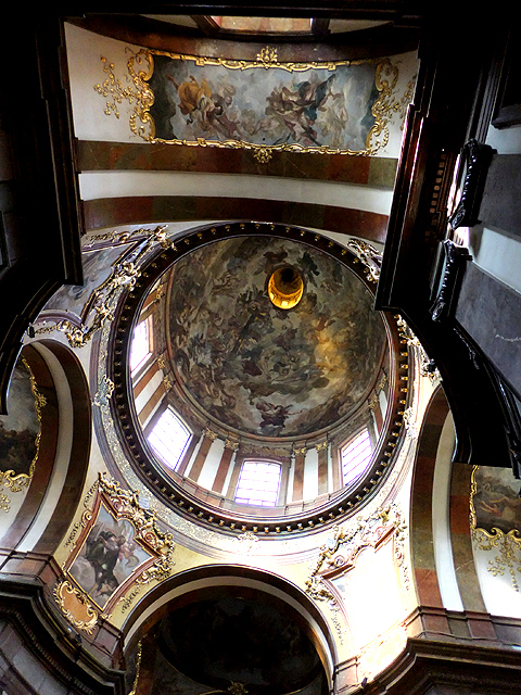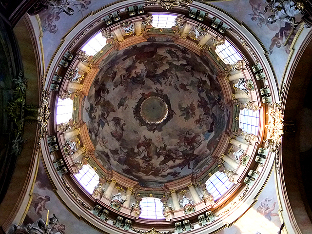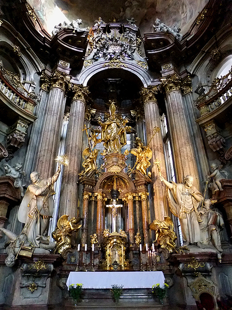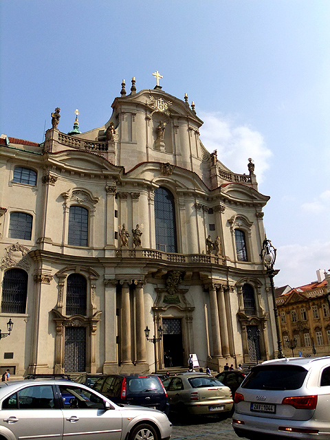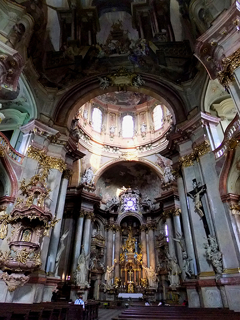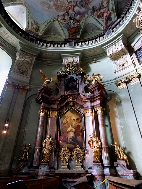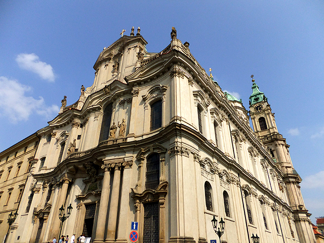 在這兩座耽擱了不少時間,所以我行於查理大橋便不敢分心,假作麻木地快速穿入對岸小區。若提恩教堂是舊城區地標,那聖尼古拉斯教堂便為小區紅瓦屋舍間的巨木,於繁花裡矗立,在銀亮枝幹上織出一抹青碧。先前於各個遠眺點,都能望見它攜著採光罩的銅綠拱頂與鐘塔,此時走至其立面端看,窗框自然有拱弧框邊,且牆體也起伏如微浪,帶出巴洛克式的流動。有著捲渦的愛奧尼克飾柱綴上鑲金聖者,最頂的波形山牆亦以龕室置放了聖尼古拉斯。