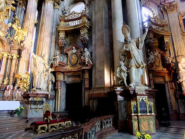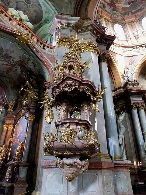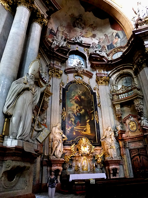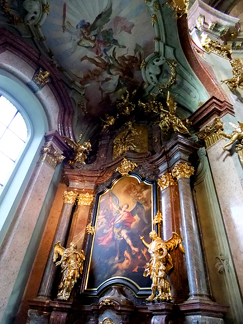 往前走,看天使飛舞講道壇,追逐頂上耀芒,然後我於廳堂十字交會處,定立望著主祭壇。筆直圓柱支起層層相套的龕室,金色聖尼古拉斯與持杖天使們在外,護著裡下被釘於十字架的耶穌。以主祭壇為中心,瑰麗的雕琢往兩側延伸環圍,爬漫成花藤的窗台與生動人像相交錯,右側主教低垂眼眉慈祥與天使講道,左方則擎起電叉制伏倒地惡魔。不似多數塑像呆板站立,而用揮揚肢軀上演生動劇目。