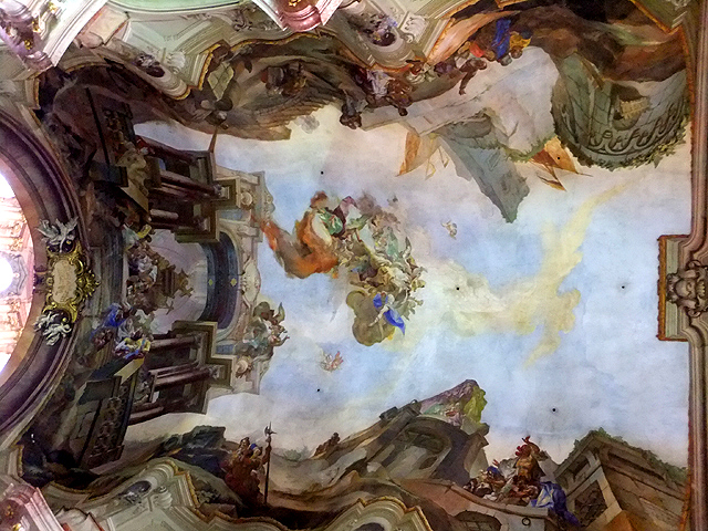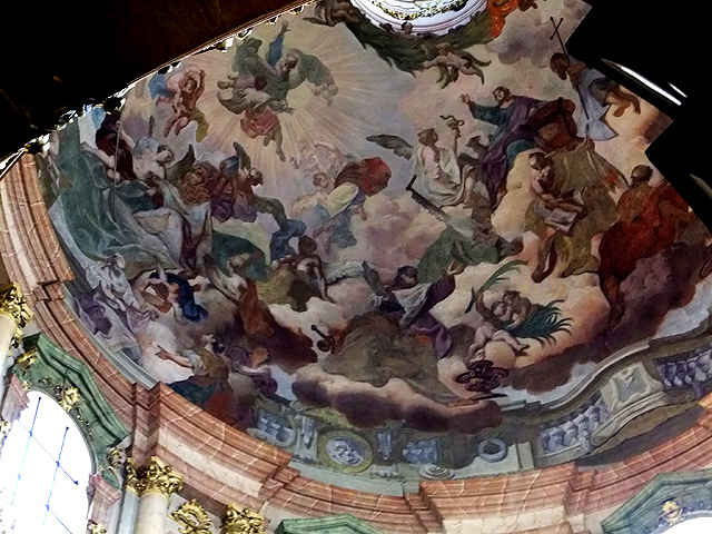 瞥見一旁樓梯指示著藝廊,我連忙攀爬而上。二樓廊側懸掛著幾件畫作,但我卻無暇細賞,只是緊倚護欄,翹首盯望那離我近些的天篷彩繪,看諸聖與天使在雲海中騰遊。再往旁行,實柱在畫裡獲得延伸,轉化作城殿,堆砌成牆後山巒。人們宛如朝聖般,聚攏至當中拱門,循階而上,望著霧煙裡的聖尼古拉斯。