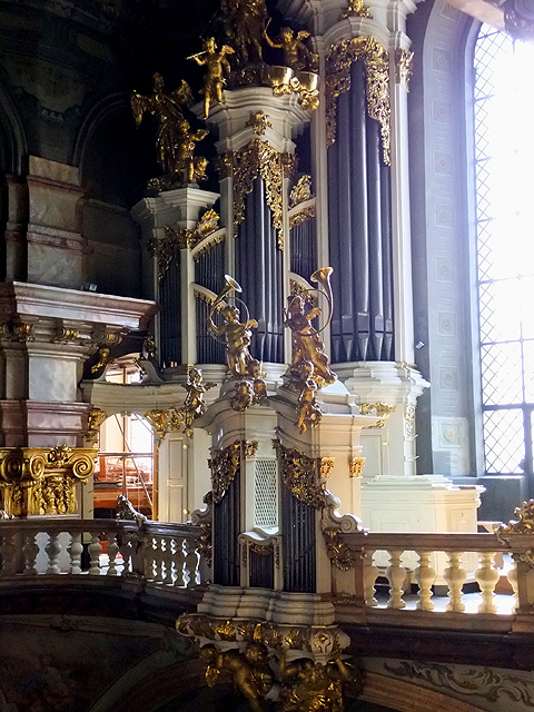 廊的盡頭連向大門上莫扎特彈奏過的管風琴,鐵灰色琴管在天窗兩旁疊層,以曲弧白石收邊,金色小天使們各持笛號,於輝日烈芒下耀眼歡騰。似乎還有個身影飛舞十指,讓聖樂隱隱迴響。
