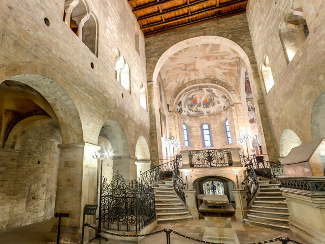 從資料圖片看,再往內的正廳保留古老式樣,有仿羅馬的厚重牆柱與圓拱,以石塊拼組的壁面沒用雕刻多加點綴,不過主祭壇倒以弧階從兩側繞上,並添上墨黑雕花欄,襯著穹頂斑駁壁畫,有種別於以往所見的風貌。據說堂內音響效果不錯,每逢春季便於此舉行演奏會。