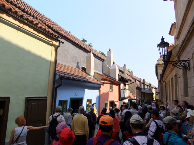 然當時的我也只能跟著隊伍續往廣場後方的黃金巷(Golden Lane)。這兒本為城牆邊低下階層隨便搭蓋的違章建築,會有這樣名稱是因謠傳當年此處居住著煉金術士,可以想像陰暗屋簷下,以兜帽掩去眉眼的身影正念咒畫陣,週邊鍋釜漫著濃煙。