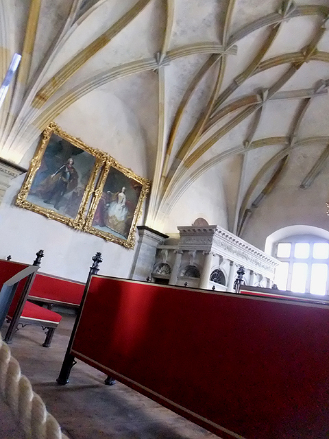 想著或許大廳訴求的是肅穆莊重,別的房間可能會有豪奢雕琢。然順著走進隔壁議會廳,類似的交錯肋拱下,幾排簡單紅布椅橫列,牆面人物畫像以金邊作框,雖然金框綴上雙頭鷹與寶冠,但整體依舊沒啥皇家氣勢。角落倒有座長方小隔間,看似某種準備室,它用白石細緻雕出飾帶、立柱、半圓窗,感覺該有其慎重用途。