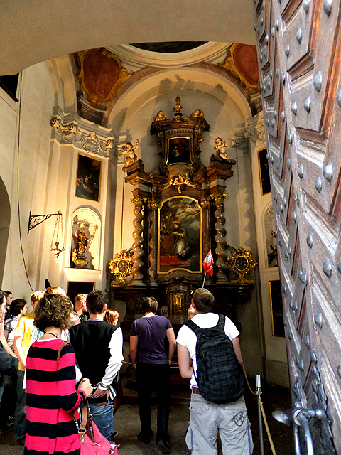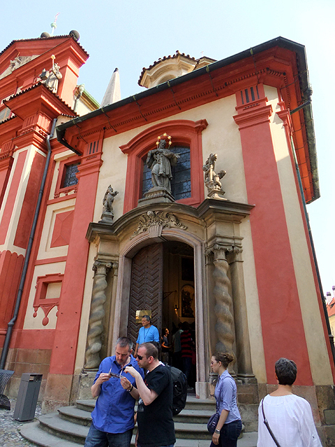 教堂在十世紀便矗立於此了,雖說歷經火焚後,正面以巴洛克式砌出山形牆,側邊下拉微彎,然總覺它少了典型帶著流動感的波旋要素,僅在米色牆上以磚紅漆出柱身與方框,倒比較偏向文藝復興的簡潔形貌。不過顏色上的強烈對比、三角楣的聖喬治屠龍雕畫,還是讓人忍不住多看幾眼。但領隊絲毫沒放我們去繞的意思,直往旁路行去,我只好趁亂從側門望進並快速拍張照。感覺此門框那頂著人像的螺旋柱,與門廳內的綴金祭壇還比較是巴洛克風格。