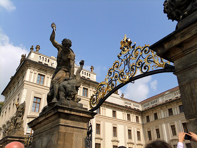 相比舊皇宮的樸實,大概贏不了裡子不能再輸面子,這城堡門庭總算有著該有氣派。鐵籬以金漆點上花藤,柱首立著天使,右邊有代表摩拉維亞的老鷹,左側為象徵波西米亞的雙尾獅。除了以天使依伴威武鷹獅,鑲冠鐵門畔還有高大巨人揮舞劍棒斬殺敵寇。雕像凝聚扭打態勢,很有睥睨天下的氣魄。