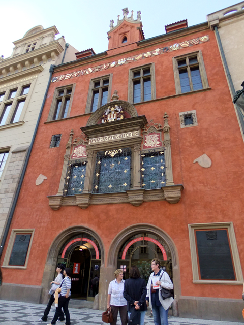 走出至廣場,迎面的是來此最早見到的舊市政廳。牆面爬漫著歲月帶來的斑污,不過帶著凸出柱形窗臺的中段樓層仍看得出精心設計,以長拱窗與人像飾柱交錯串聯,並綴上許多代表家族的印記。而再往上看是高聳鐘塔,有與火藥塔相似的尖頂。