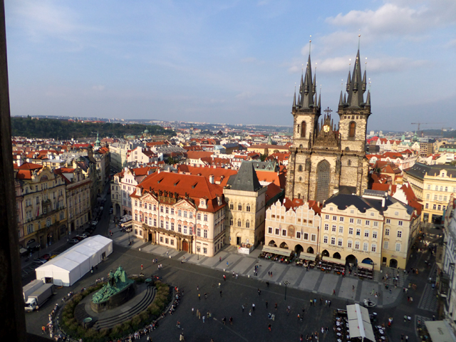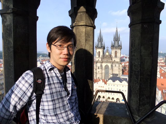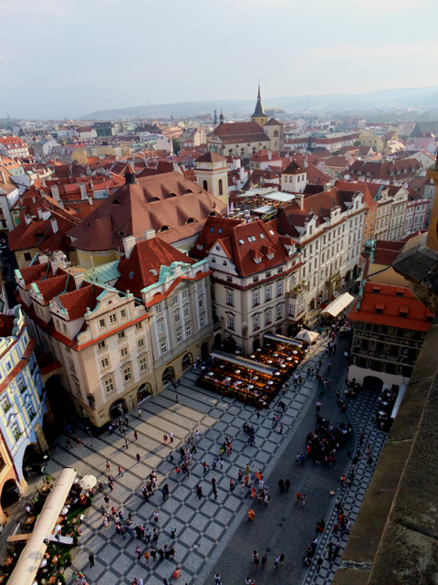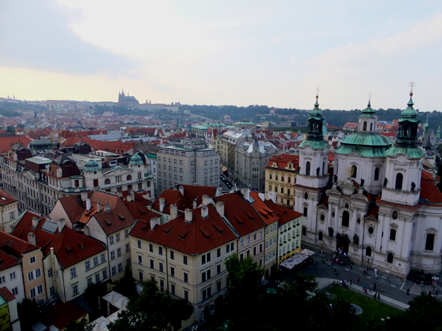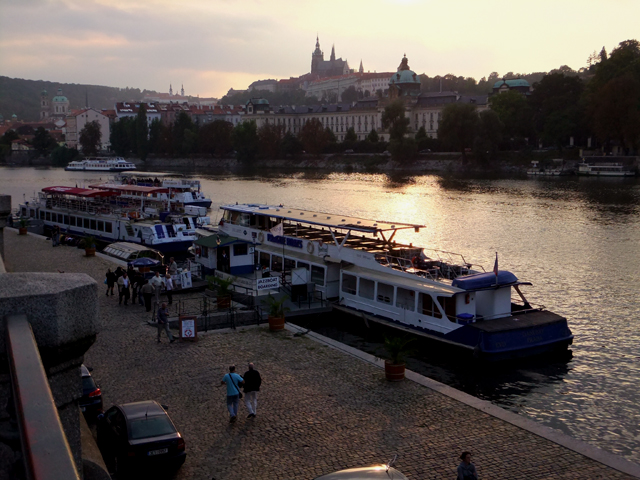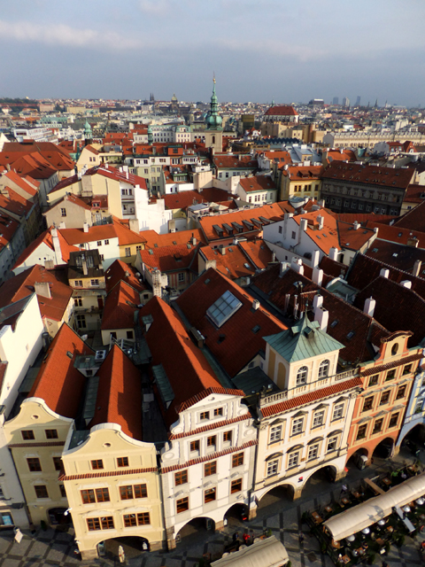 環廊空間不大,因此顯得擁擠,不過反正也不急,塞車了便倚著圍欄,眺看眼下市區。街道間的建築雖然繁密卻不雜亂,淺色樓閣頂著紅褐屋瓦,如浪花般翻騰散漾。沒有過高的突兀大廈,僅偶有幾座教堂的銅綠拱頂、尖塔,點綴這片舊時代風情。遙遠的山丘稜線上,隱隱有著聖維特教堂的輪廓,灰灰濛濛看不清晰,卻令人更為期待明日的與其相逢。