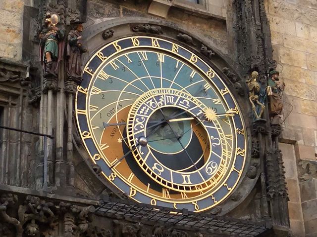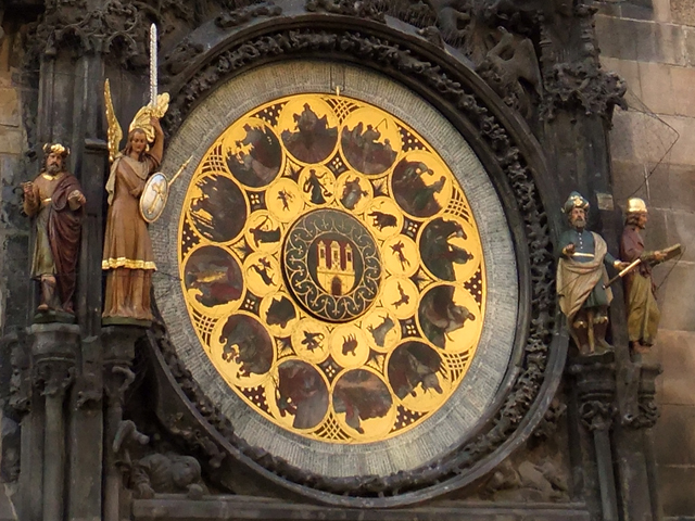 雖塔頂也有一般時鐘,然塔底壁面卻另設兩片上下相接的大圓盤,以星象指示時間。下鐘盤其實算個日曆,中心繪著代表布拉格的城堡,然後如花瓣般,往外層層綻放圓形組畫,先為黃道十二宮,再來是各月份的人民生活,最外密密刻分三百六十五天。圓盤隨時間轉動,盤緣指針便能顯示日期與月份。