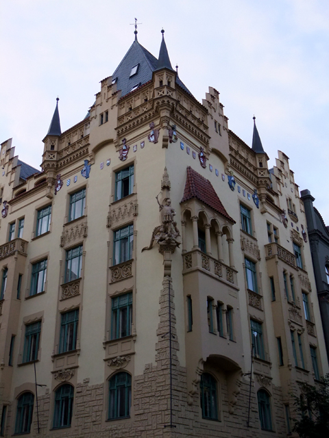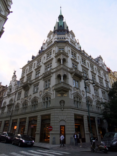 這條往北的街道在聖尼古拉斯教堂旁,一路都是名牌精品店,聚集於此處難道是猶太人會作生意的關係嗎?或許年紀尚輕抑或有良好維護,牆垣都未沾染多少風霜,且不僅進駐商家走高價路線,所見壁面也皆經過雕琢。那雕琢不是用瑰麗豔彩張揚舞弄,頂多以深淺雙色作出層次,然後於窗臺邊交錯成風景。但偶爾幾筆綴金,或拉伸出尖翹簷塔,便畫龍點睛。
