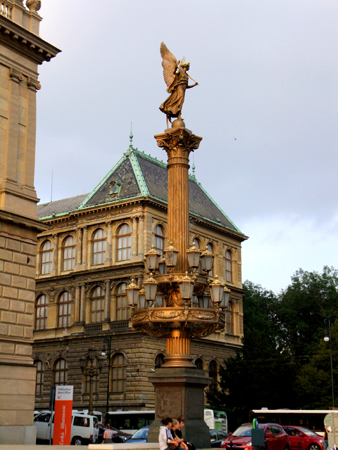 其實也不知這麼執著是為了什麼,畢竟動力不過來自書本裡的小小照片,但眼前這棟用作音樂表演、美術展示的黃褐岩砌建築,在落日輝映下,倒真透著幾分沉凝莊嚴。雙層窗廊將門面往外微拉成弧,除了台階旁護守的墨黑雕像外,兩側又各立了燈柱。不似牆面的簡約,柱身被精雕燈座環環簇擁,最上還有持著花環的展翼天使。