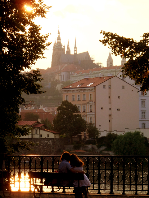 天使迎風顧盼,想必在那兒更能望清一旁河岸景緻吧。此時的伏爾塔瓦河波光粼粼,圍欄步道上遊子閒適望著夕陽餘暉,還有戀人於樹蔭涼椅相擁。他們看著對岸聖維特教堂的鏤空尖塔,看那最後的焰色將其細細勾邊,似乎這短暫光影已化作永恆,深烙心坎。