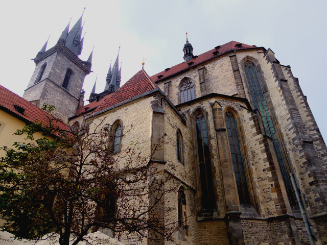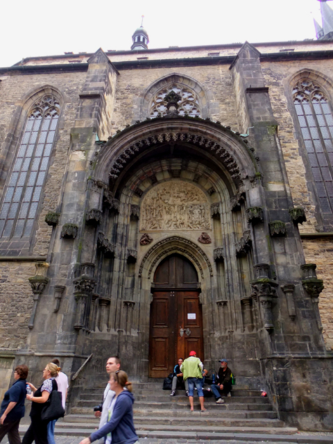 在連通舊城廣場與提恩中庭的小徑上可望見提恩教堂的側背,有著整列長拱窗的牆面烏烏沉沉地,看來很有歷史。側門門楣的浮雕倒相當潔淨,以繁多細小人形呈現耶穌上十字架的情景。