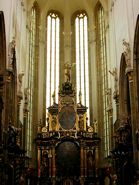 也不知當年是怎樣的因由,居然讓一列提恩學院遮住其正立面,我稍微找了一下,才尋得小路鑽進。很不幸地,它大門緊閉,我也不敢唐突去推,試探詢問一旁像守門人的,他竟指著門旁字牌要我自己看。然那上面似乎只有捷克文,難道他以為我這東方人會識此天書?若唯一能看懂的數字代表時間,那現在該是開放的啊?猶豫半晌,終於偷偷輕推了下門。