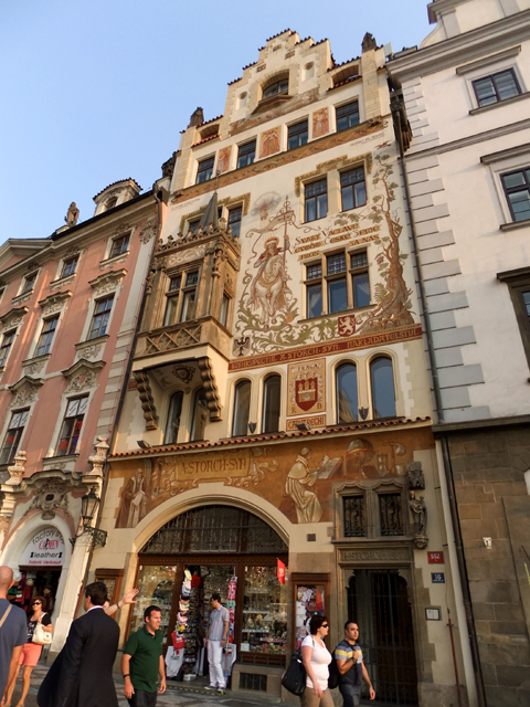 此外,廣場週邊建築還都滿值得細細品味的。若面對提恩教堂,右手側有棟石聖母之屋,這稱呼該是因牆側有尊抱著耶穌的小聖母雕像,然滿佈牆面的壁畫卻大大遮掩其風采。例如拱門之上繪有專心研究的學者,三、四樓的精雕窗臺旁則飾以於林葉間奔馳的騎士,描述聖瓦次拉夫(St. Wenceslas)帶隊出征的情景。這樣顏色清晰艷麗的彩繪延伸至階梯狀頂簷,輕易地便吸引遊人目光。