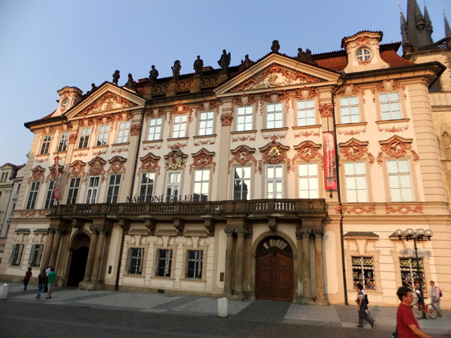 而如從提恩教堂往左望,會見到葛茲金斯基宮(Goltz-Kinsky Palace)。那原是葛茲伯爵的宅邸,而後轉手至外交官金斯基,現在則為布拉格國立美術館分館。其造型也自哥德式、文藝復興,一路轉成現在粉底鑲紅的洛可可裝飾,在成列窗框與山形門楣團繞緋炎。